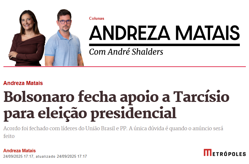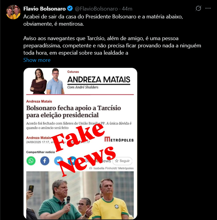 “Acabei de sair da casa do Presidente Bolsonaro e a matéria abaixo, obviamente, é mentirosa.Aviso aos navegantes que Tarcísio, além de amigo, é uma pessoa preparadíssima, competente e não precisa ficar provando nada a ninguém toda hora, em especial sobre sua lealdade a Bolsonaro.Não conseguirão separá-lo de Bolsonaro e tenham a convicção de que estaremos juntos em 2026, para desespero da extrema-esquerda, que deve morrer de inveja de não ter um Tarcísio em seus quadros.Estamos juntos, Tarcisão!”