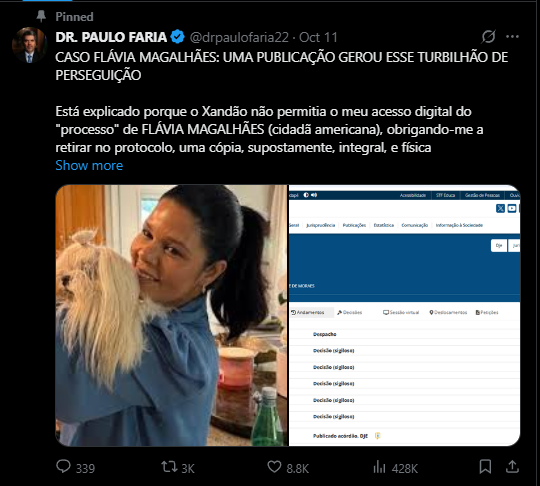 “Está explicado porque o Xandão não permitia o meu acesso digital do “processo” de FLÁVIA MAGALHÃES (cidadã americana), obrigando-me a retirar no protocolo, uma cópia, supostamente, integral, e física digitalizada.