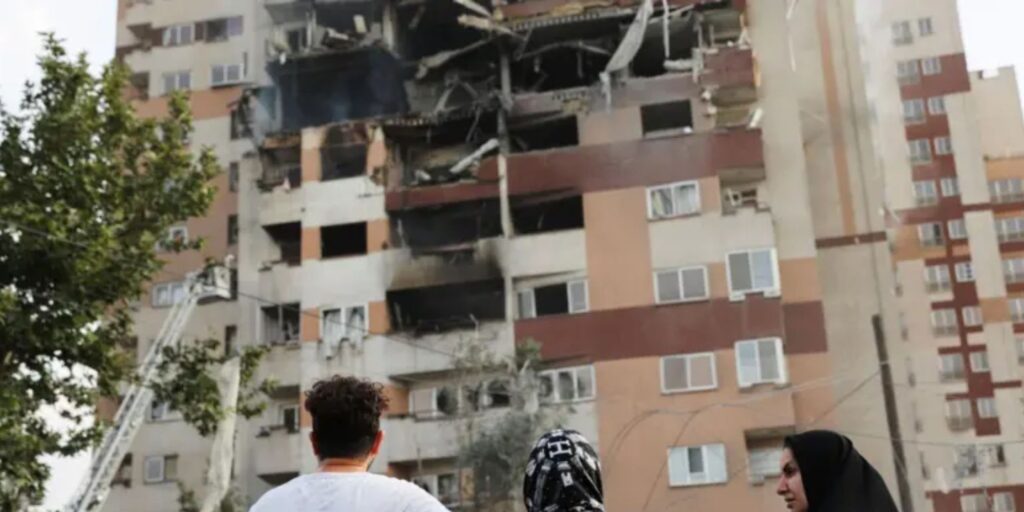 Pessoas observam um prédio danificado após ataques israelenses em Teerã, no Irã. O ataque de Israel ao Irã não só foi mais