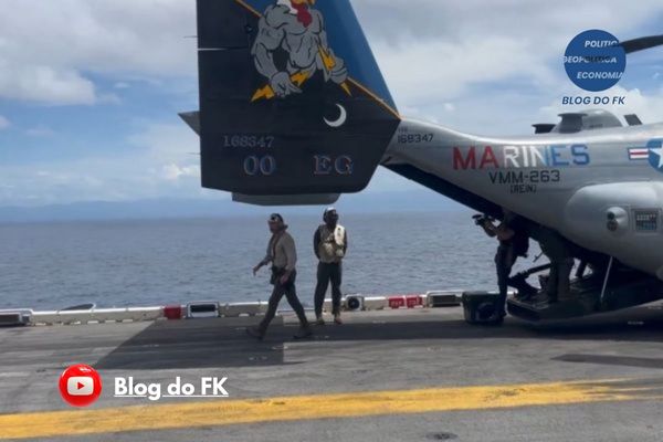 Vídeo divulgado pelo governo americano mostra Pete Hegseth desembarcando no USS Iwo Jima nesta segunda-feira (8). Mais cedo, secretário visitou