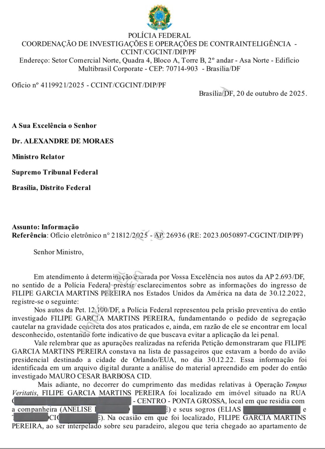 Confira A íntegra do ofício da PF a Alexandre de Moraes sobre a entrada falsa de Filipe G. Martins nos EUA: