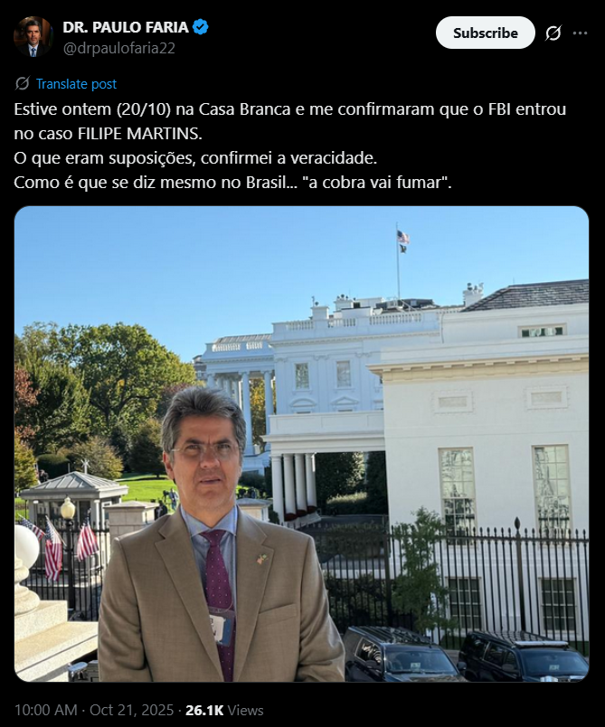 “Estive ontem (20/10) na Casa Branca e me confirmaram que o FBI entrou no caso FILIPE MARTINS. O que eram suposições, confirmei a veracidade. Como é que se diz mesmo no Brasil… “a cobra vai fumar”., escreveiu