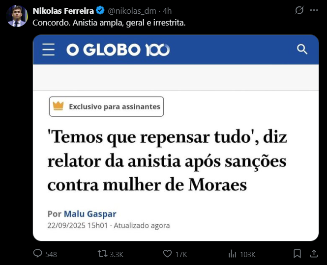 Temer ecoa o relator da anistia no Congresso, deputado Paulinho da Força (Solidariedade). Em entrevista à jornalista Malu Gaspar, afirmou que terão que “repensar tudo de novo”.