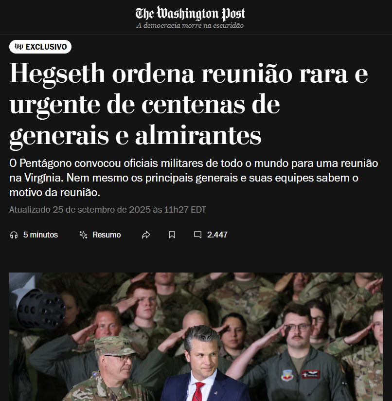 Fonte: https://www.washingtonpost.com/national-security/2025/09/25/hegseth-generals-quantico-meeting/