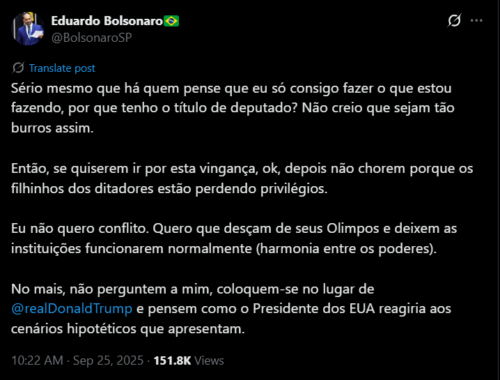 Eduardo divulgou uma postagem na rede social X, onde escreveu: