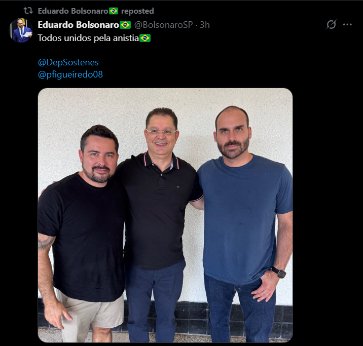 – “Qual a parte ainda que não me fiz entender? Dosimetria não é anistia, logo, não pacificará o Brasil. Sei que tiranos pensam apenas em seu si próprios, em seu poder. Portanto, é aí que seguiremos trabalhando em cima, até entenderem que queremos apenas um Congresso livre.”