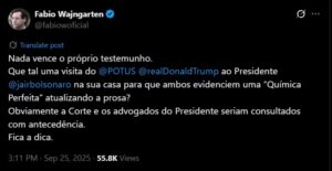 Na mensagem, Wajngarten sugeriu com entusiasmo: “Nada melhor que o testemunho direto! Que tal uma visita de Donald Trump à casa do presidente Jair Bolsonaro para mostrarem sua sintonia perfeita e atualizarem a conversa? Claro, tudo seria previamente alinhado com a Corte e os advogados do presidente. Fica a sugestão!”